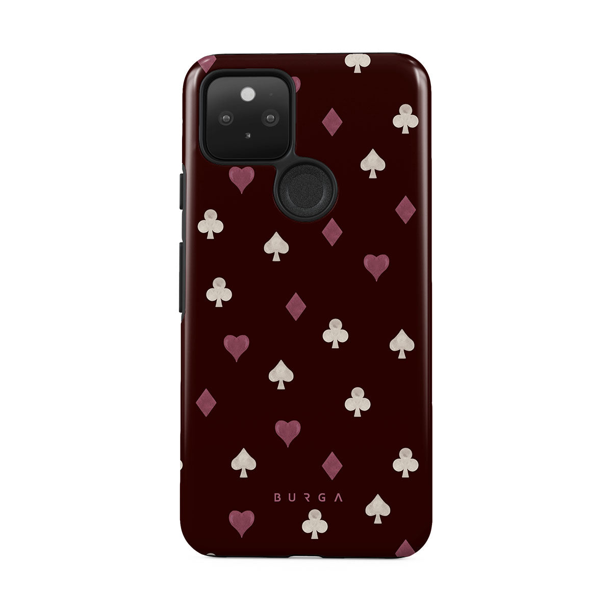 En este diseño: palos de cartas, corazones, picas, diamantes, tréboles, fondo burdeos.
