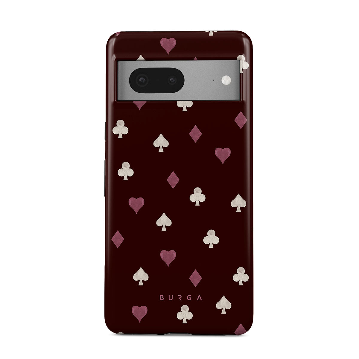 En este diseño: palos de cartas, corazones, picas, diamantes, tréboles, fondo burdeos.