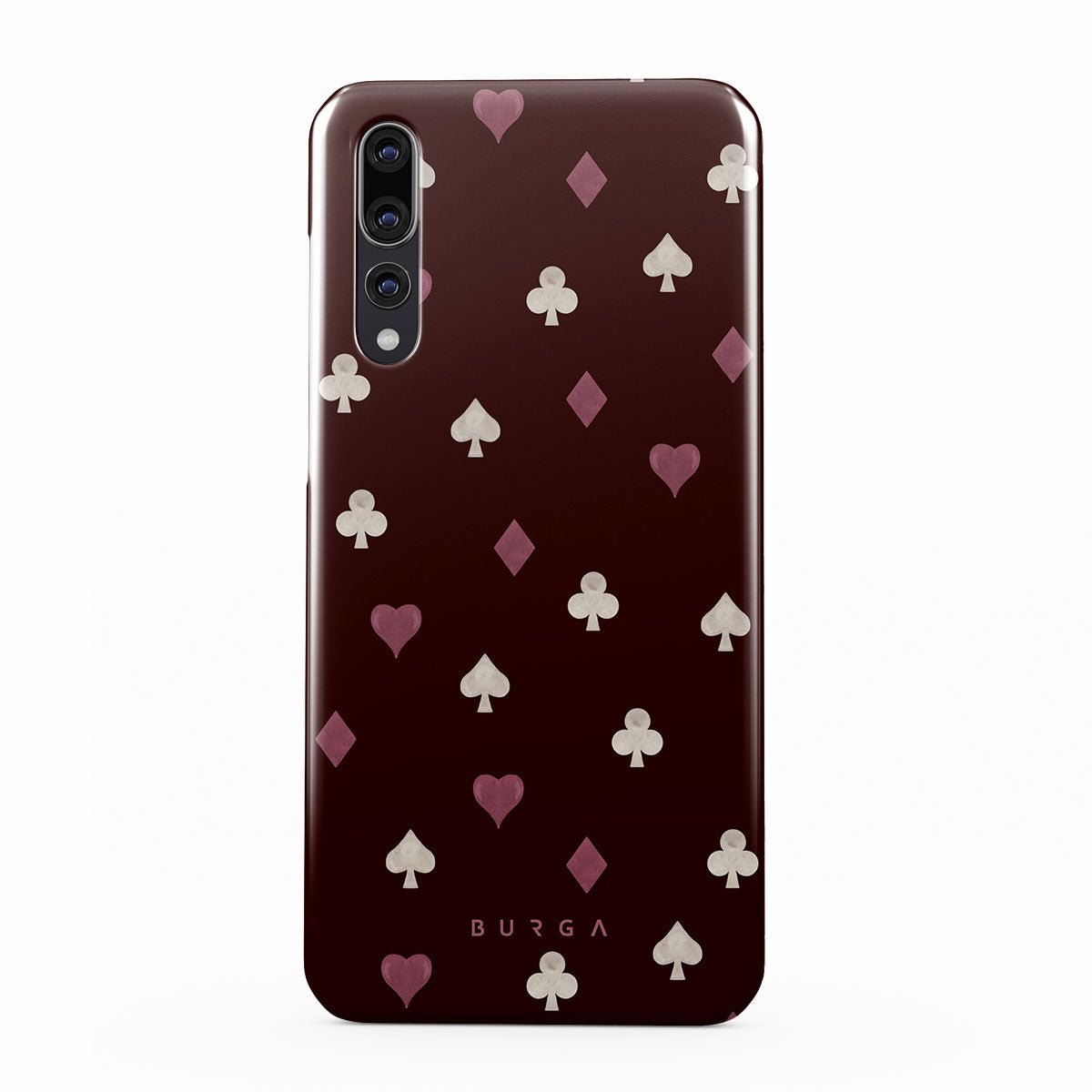 En este diseño: palos de cartas, corazones, picas, diamantes, tréboles, fondo burdeos.