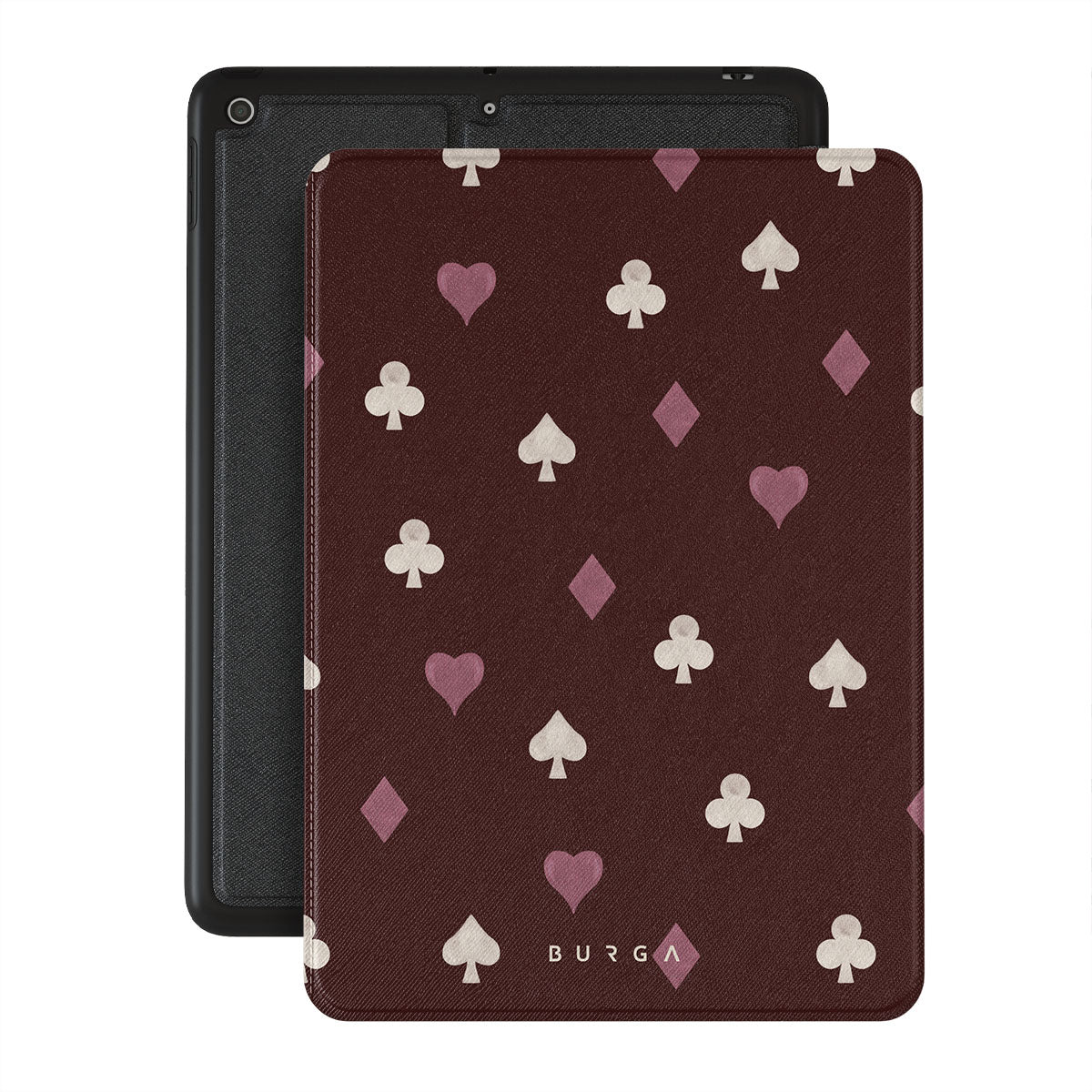 En este diseño: palos de cartas, corazones, picas, diamantes, tréboles, fondo burdeos.