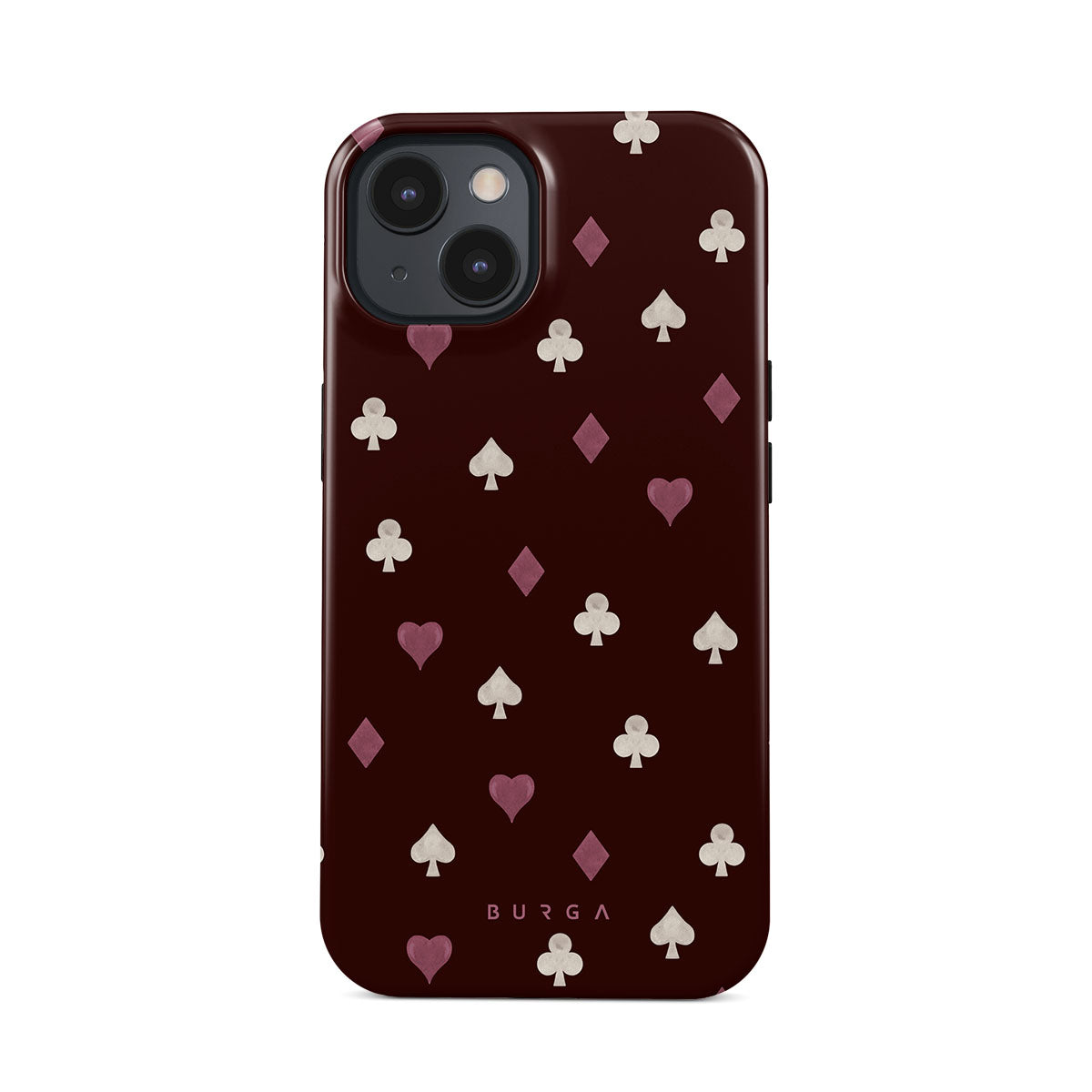 En este diseño: palos de cartas, corazones, picas, diamantes, tréboles, fondo burdeos.