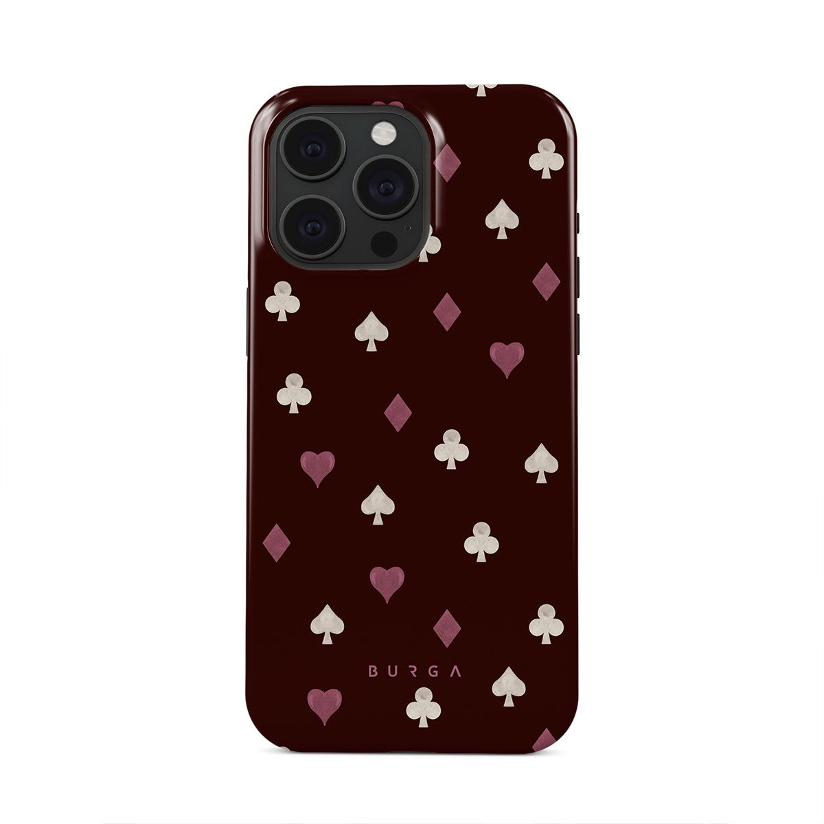 En este diseño: palos de cartas, corazones, picas, diamantes, tréboles, fondo burdeos.