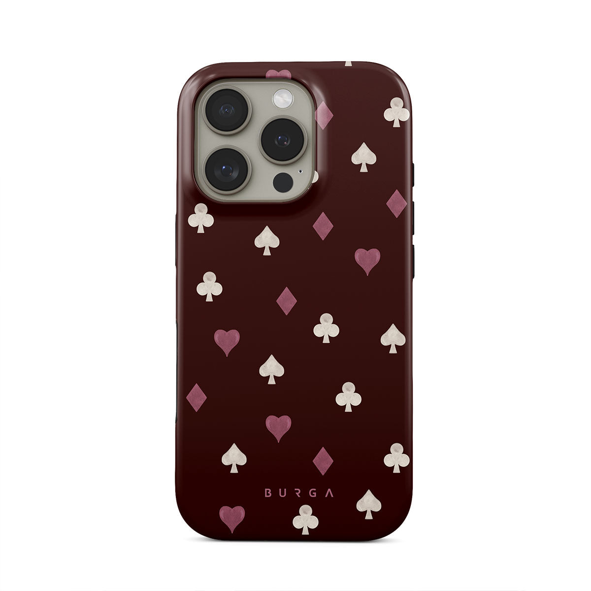 En este diseño: palos de cartas, corazones, picas, diamantes, tréboles, fondo burdeos.