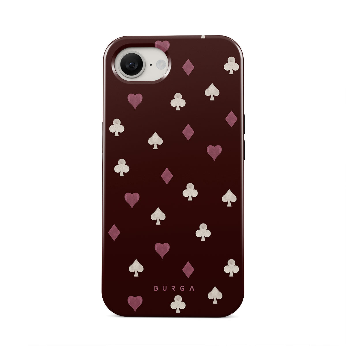 En este diseño: palos de cartas, corazones, picas, diamantes, tréboles, fondo burdeos.