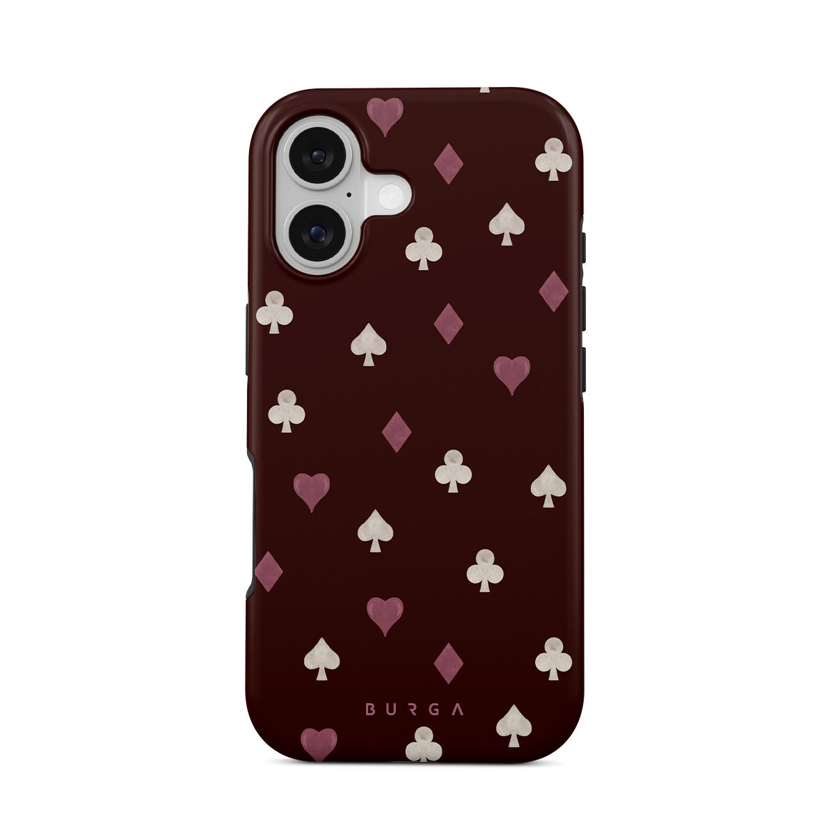 En este diseño: palos de cartas, corazones, picas, diamantes, tréboles, fondo burdeos.