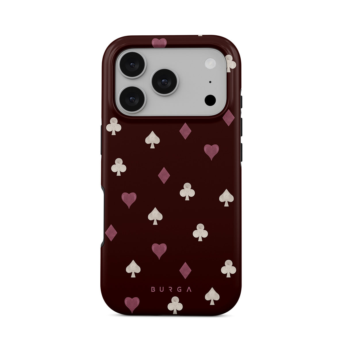 En este diseño: palos de cartas, corazones, picas, diamantes, tréboles, fondo burdeos.