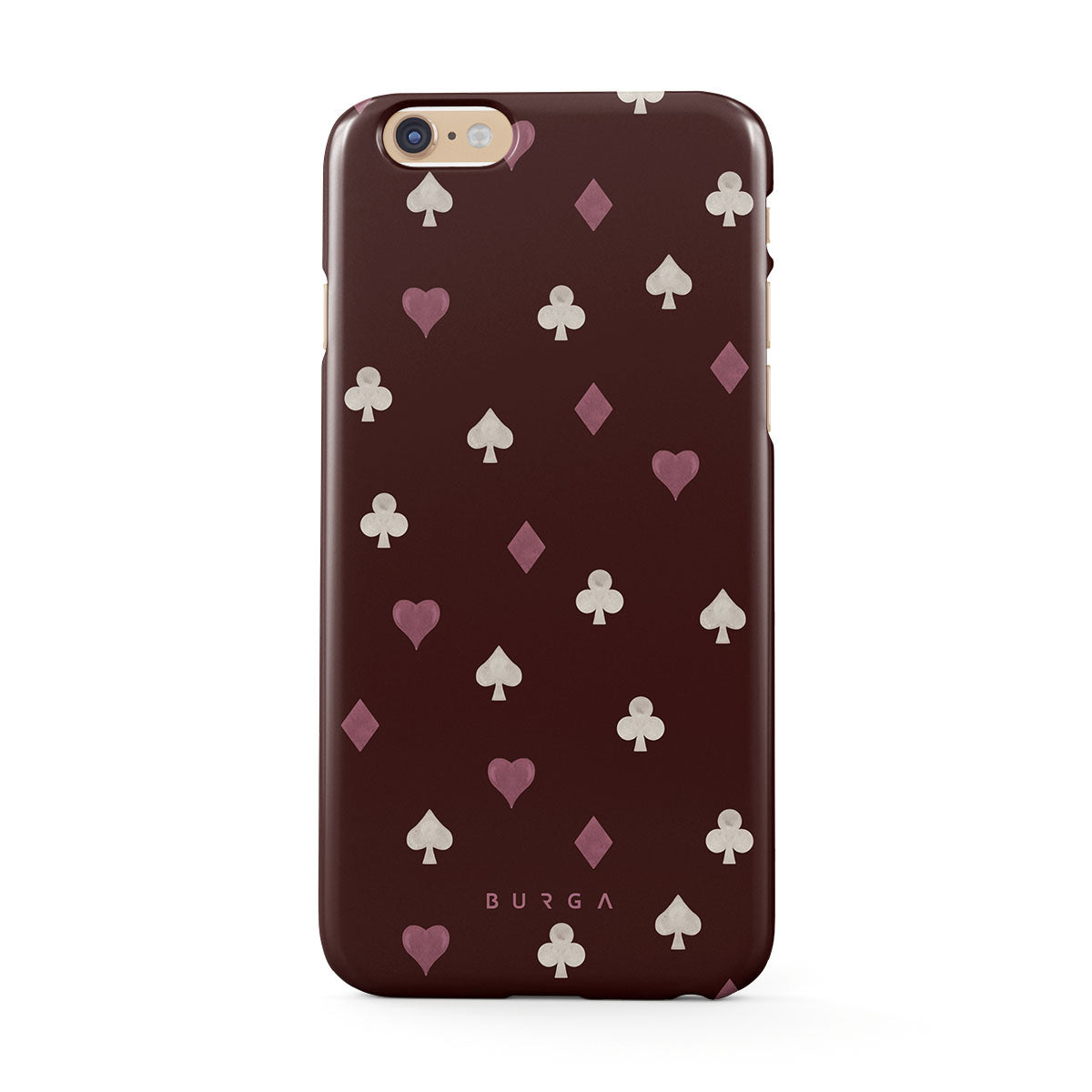 En este diseño: palos de cartas, corazones, picas, diamantes, tréboles, fondo burdeos.