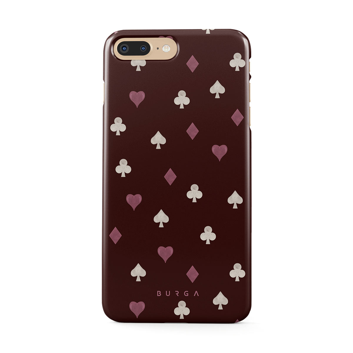 En este diseño: palos de cartas, corazones, picas, diamantes, tréboles, fondo burdeos.