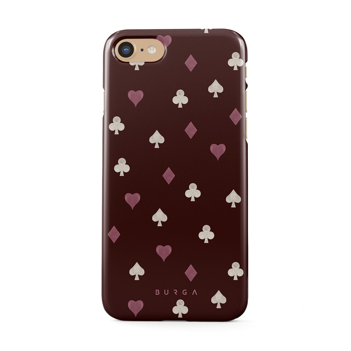 En este diseño: palos de cartas, corazones, picas, diamantes, tréboles, fondo burdeos.