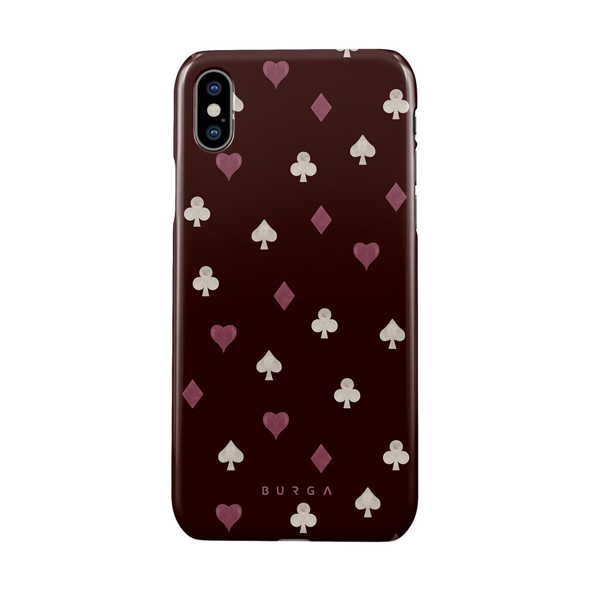 En este diseño: palos de cartas, corazones, picas, diamantes, tréboles, fondo burdeos.