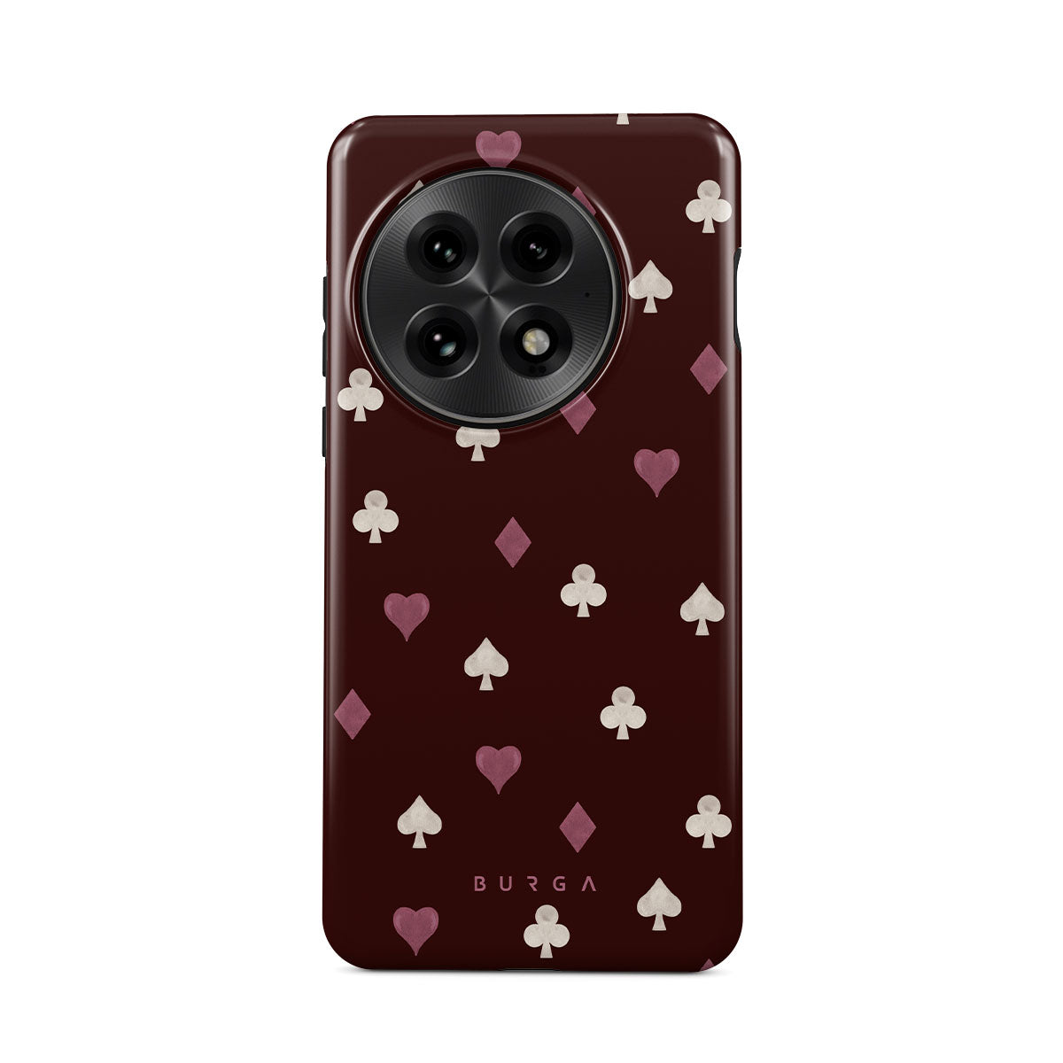 En este diseño: palos de cartas, corazones, picas, diamantes, tréboles, fondo burdeos.