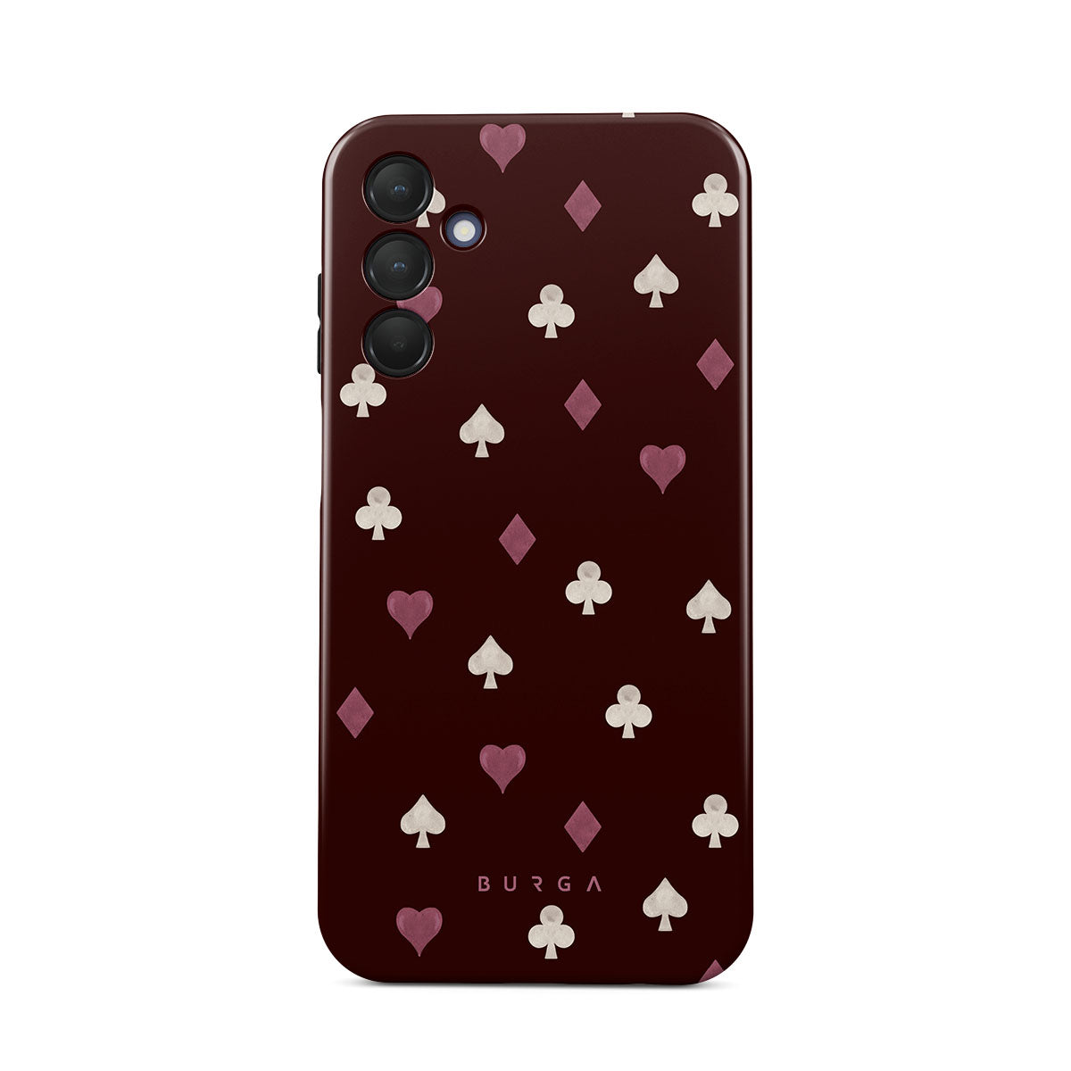 En este diseño: palos de cartas, corazones, picas, diamantes, tréboles, fondo burdeos.