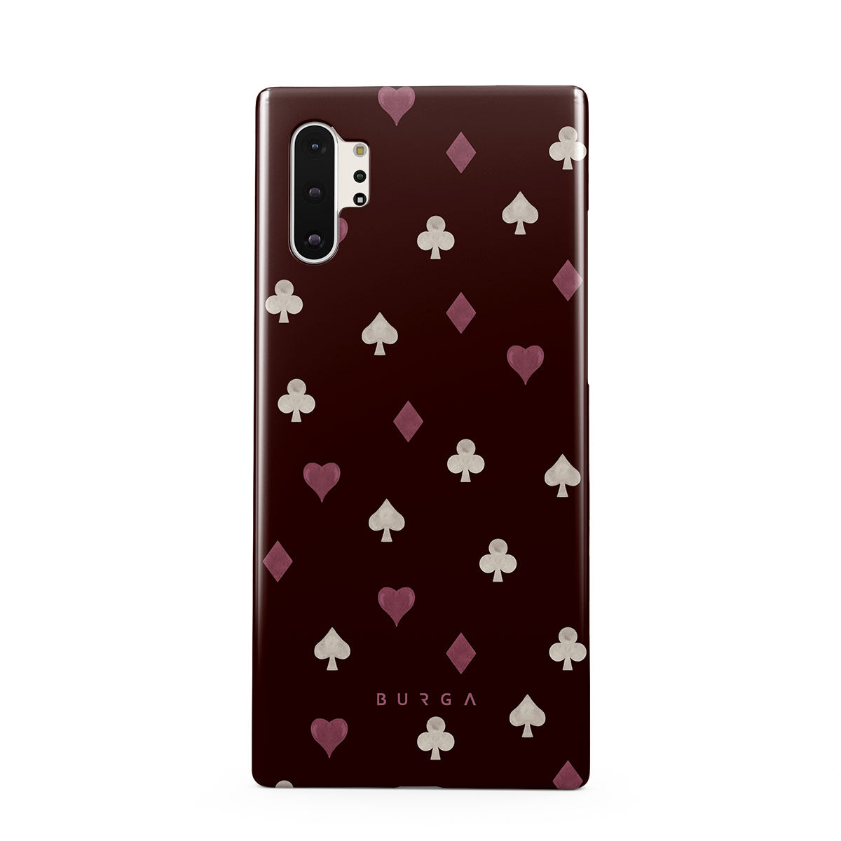 En este diseño: palos de cartas, corazones, picas, diamantes, tréboles, fondo burdeos.