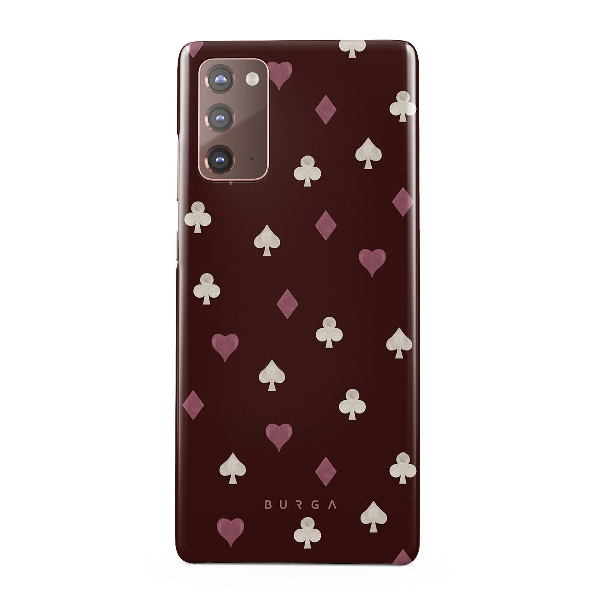 En este diseño: palos de cartas, corazones, picas, diamantes, tréboles, fondo burdeos.