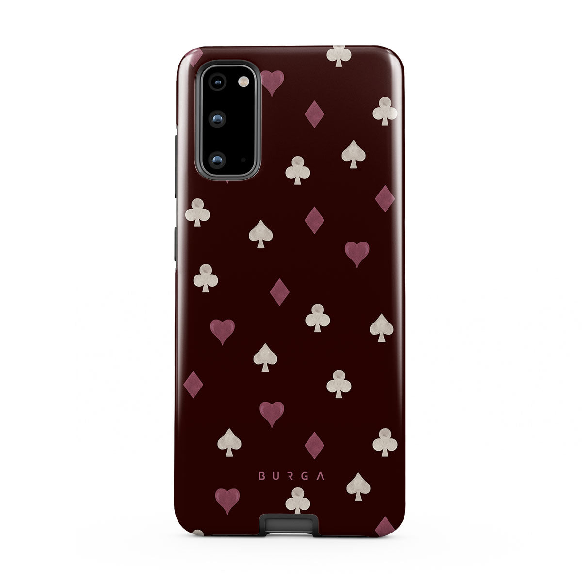 En este diseño: palos de cartas, corazones, picas, diamantes, tréboles, fondo burdeos.