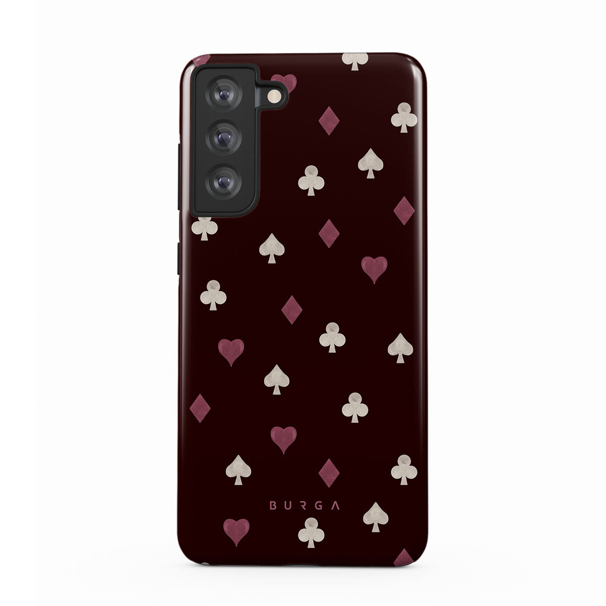 En este diseño: palos de cartas, corazones, picas, diamantes, tréboles, fondo burdeos.