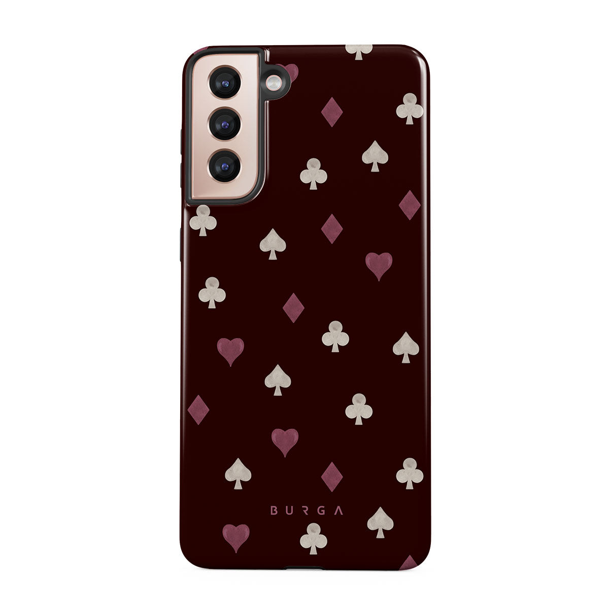 En este diseño: palos de cartas, corazones, picas, diamantes, tréboles, fondo burdeos.