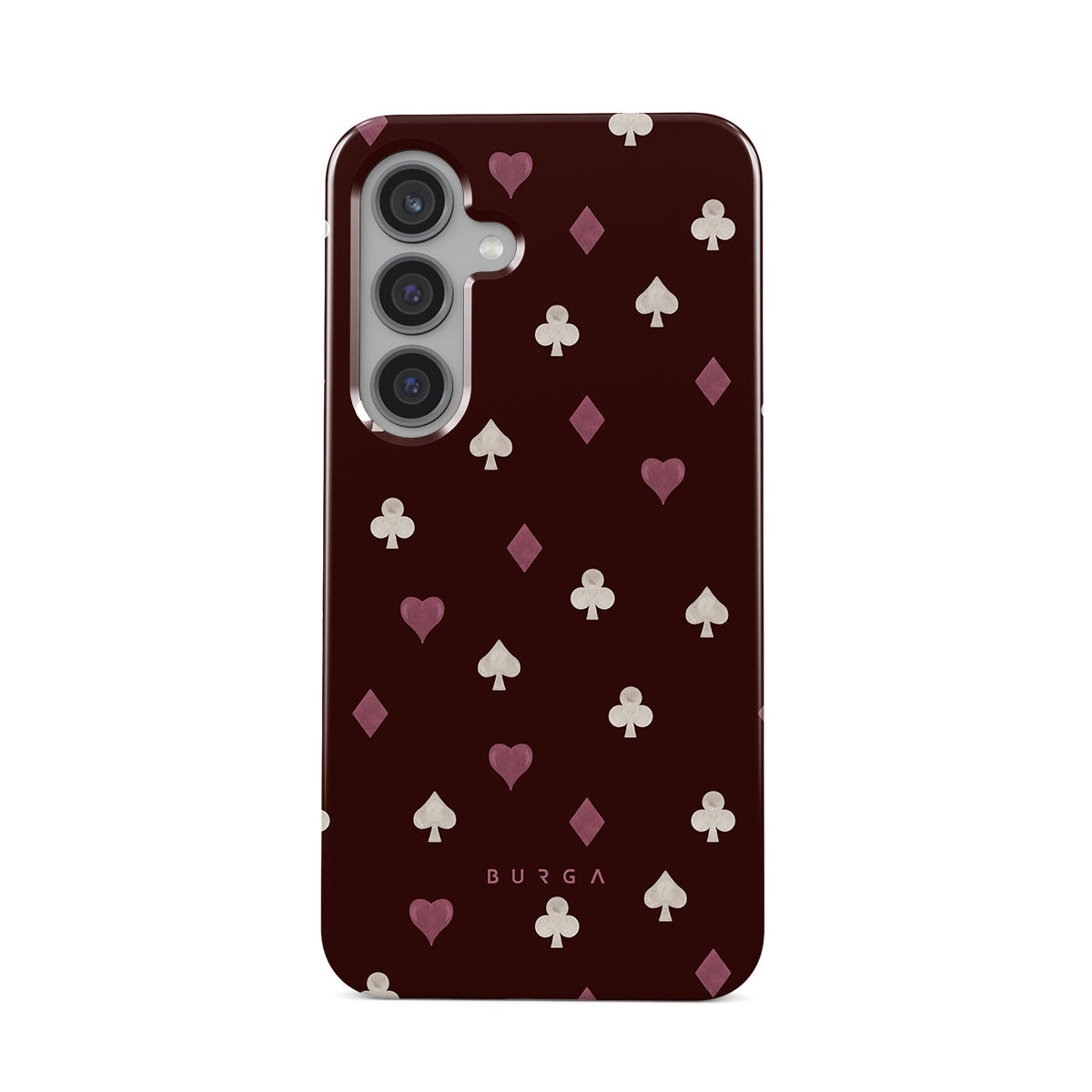 En este diseño: palos de cartas, corazones, picas, diamantes, tréboles, fondo burdeos.