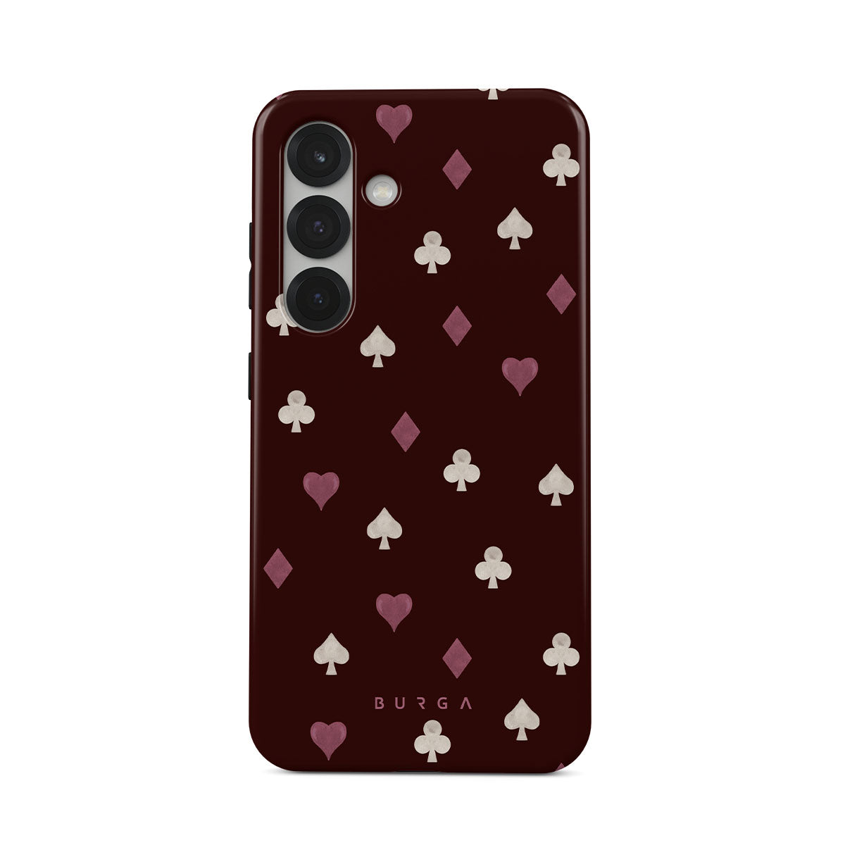 En este diseño: palos de cartas, corazones, picas, diamantes, tréboles, fondo burdeos.