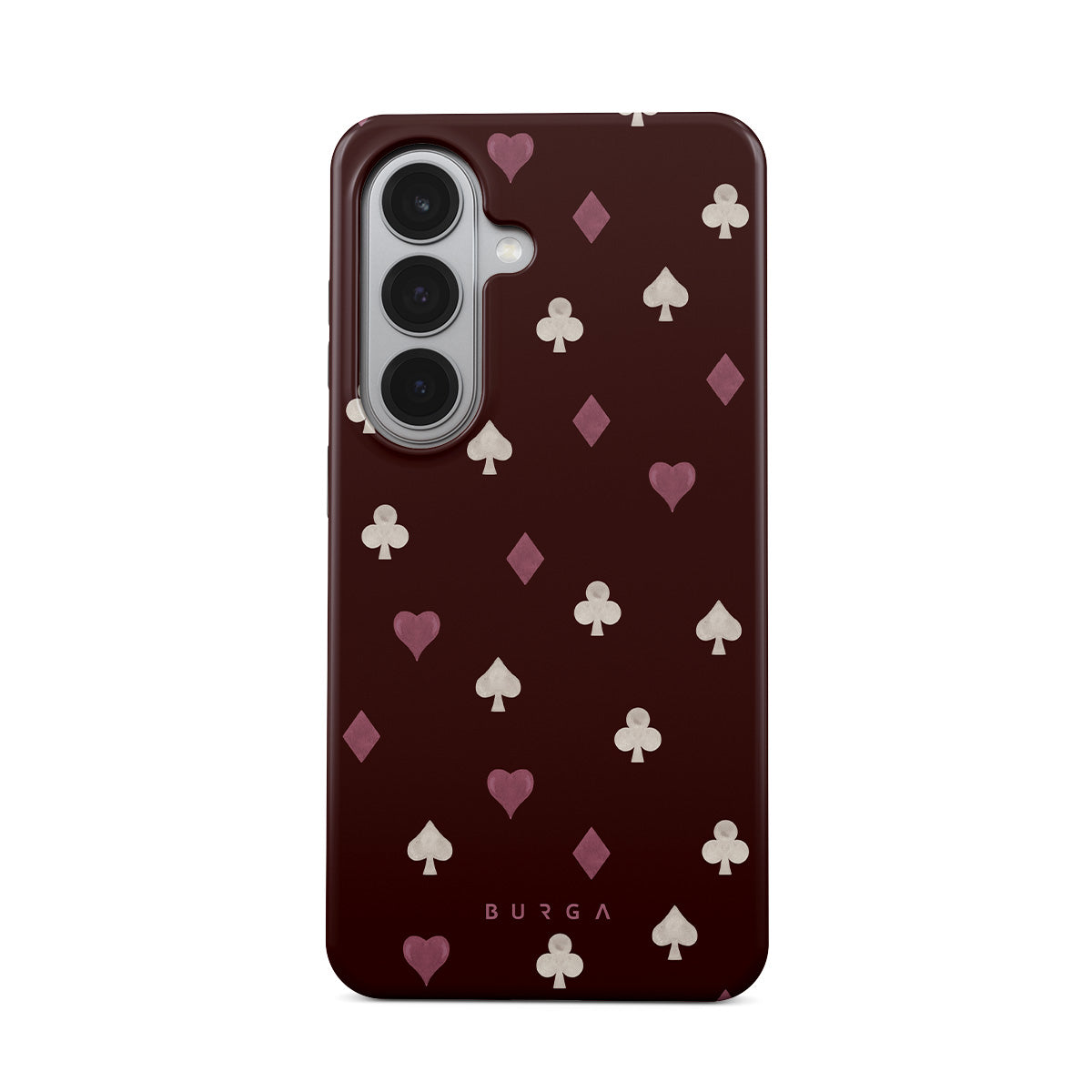 En este diseño: palos de cartas, corazones, picas, diamantes, tréboles, fondo burdeos.