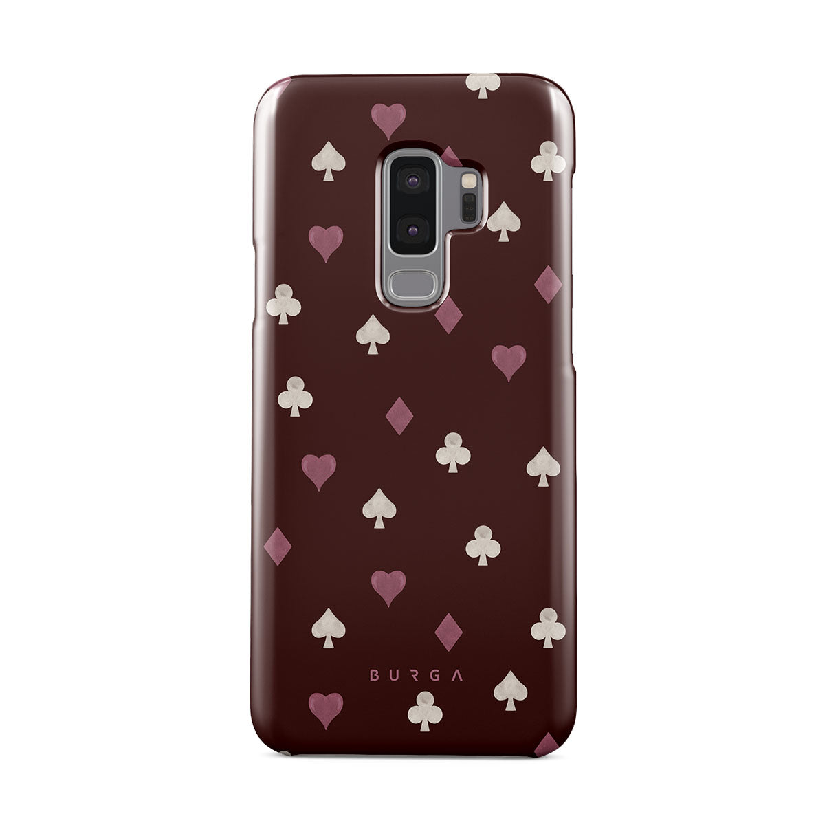 En este diseño: palos de cartas, corazones, picas, diamantes, tréboles, fondo burdeos.