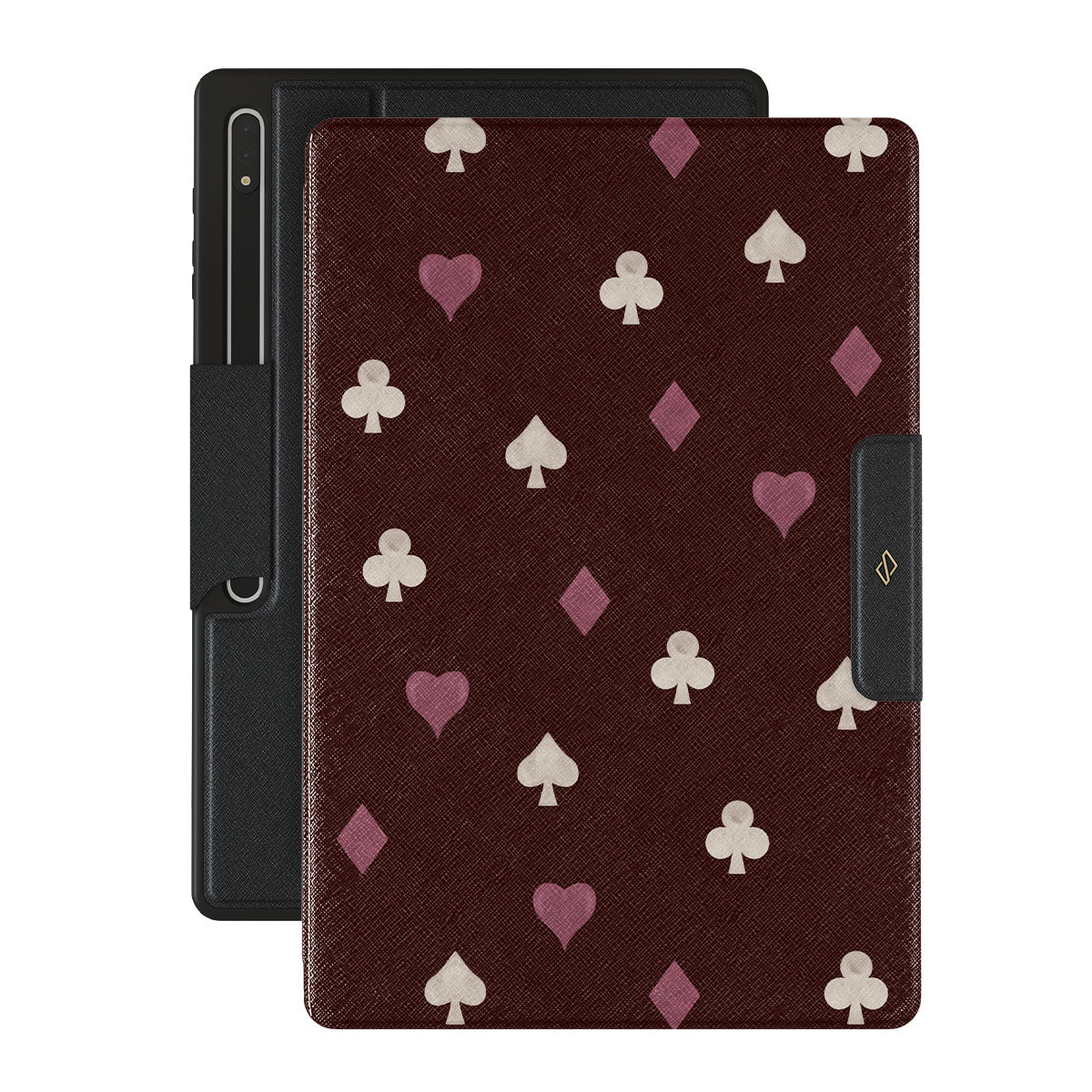 En este diseño: palos de cartas, corazones, picas, diamantes, tréboles, fondo burdeos.