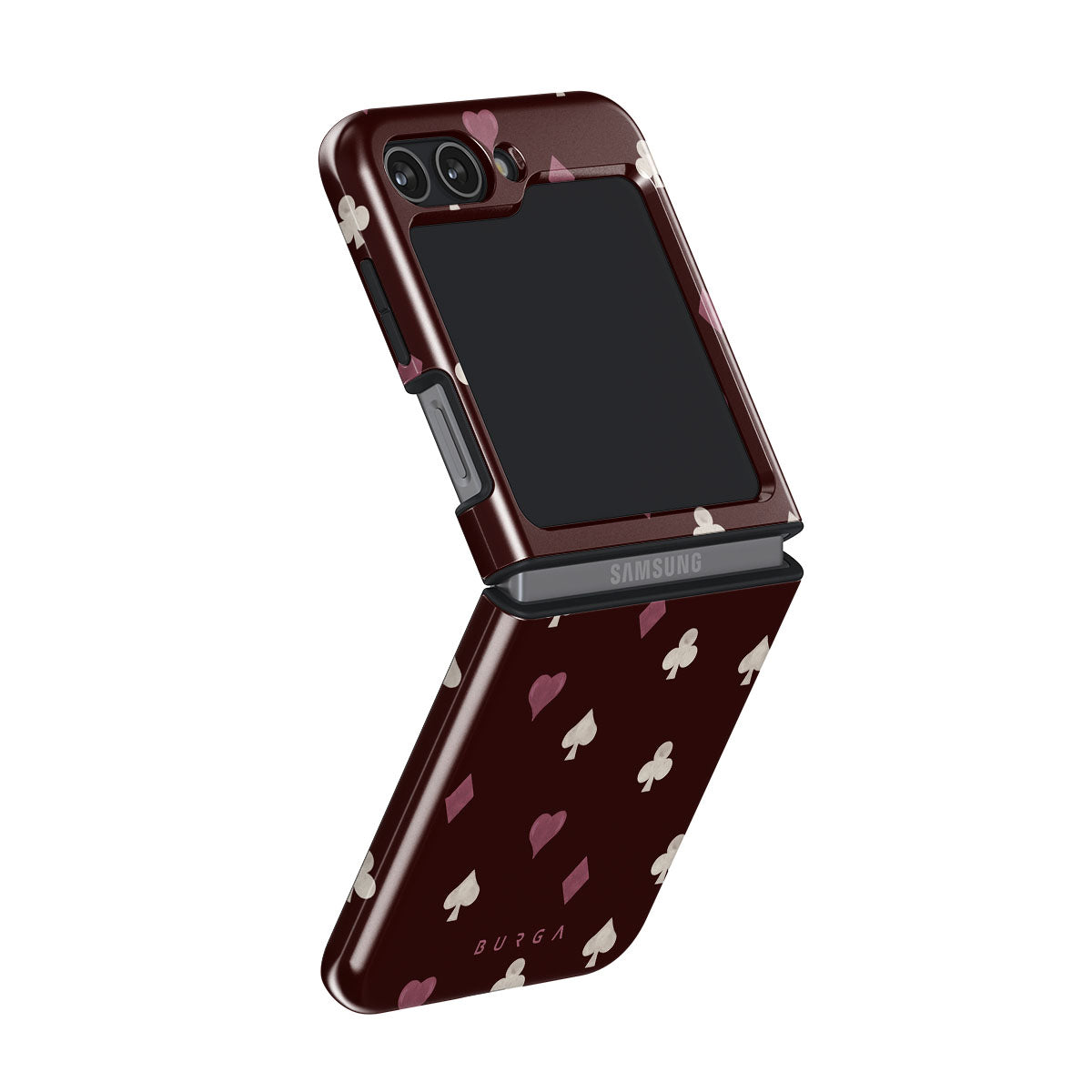 En este diseño: palos de cartas, corazones, picas, diamantes, tréboles, fondo burdeos.