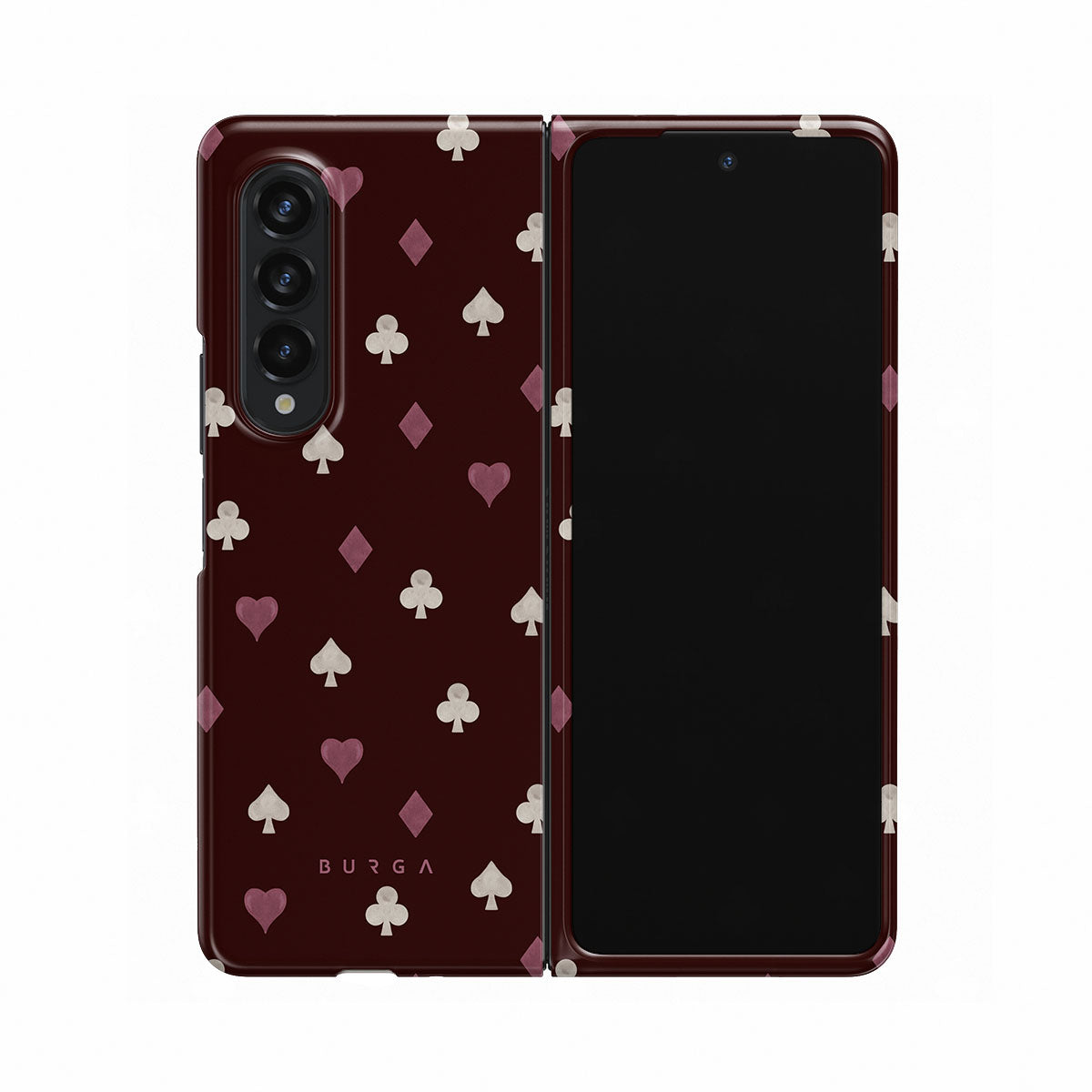 En este diseño: palos de cartas, corazones, picas, diamantes, tréboles, fondo burdeos.