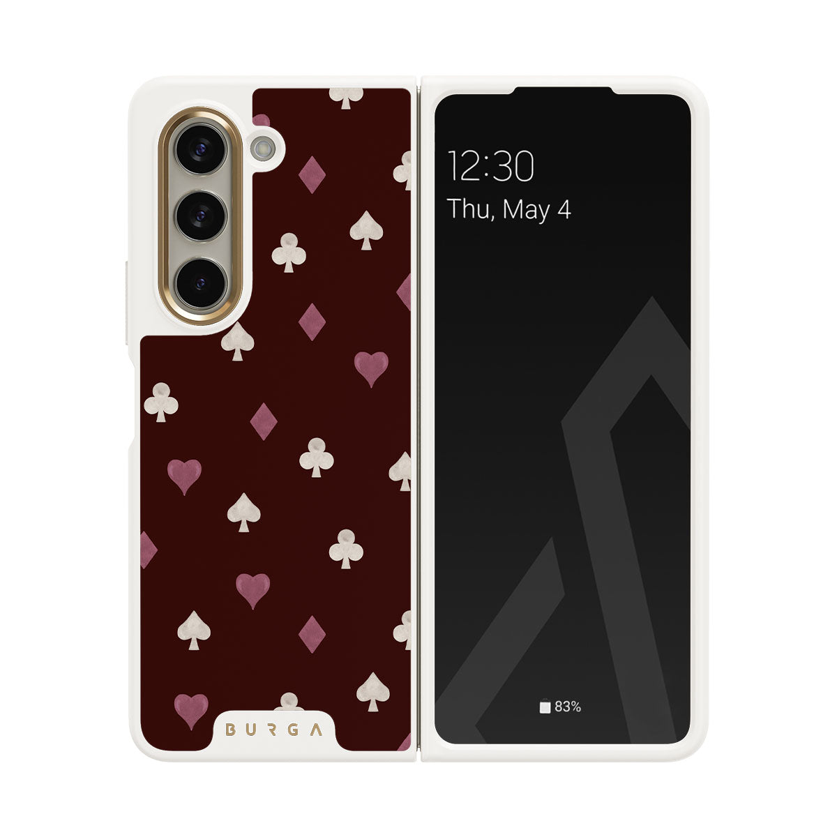 En este diseño: palos de cartas, corazones, picas, diamantes, tréboles, fondo burdeos.