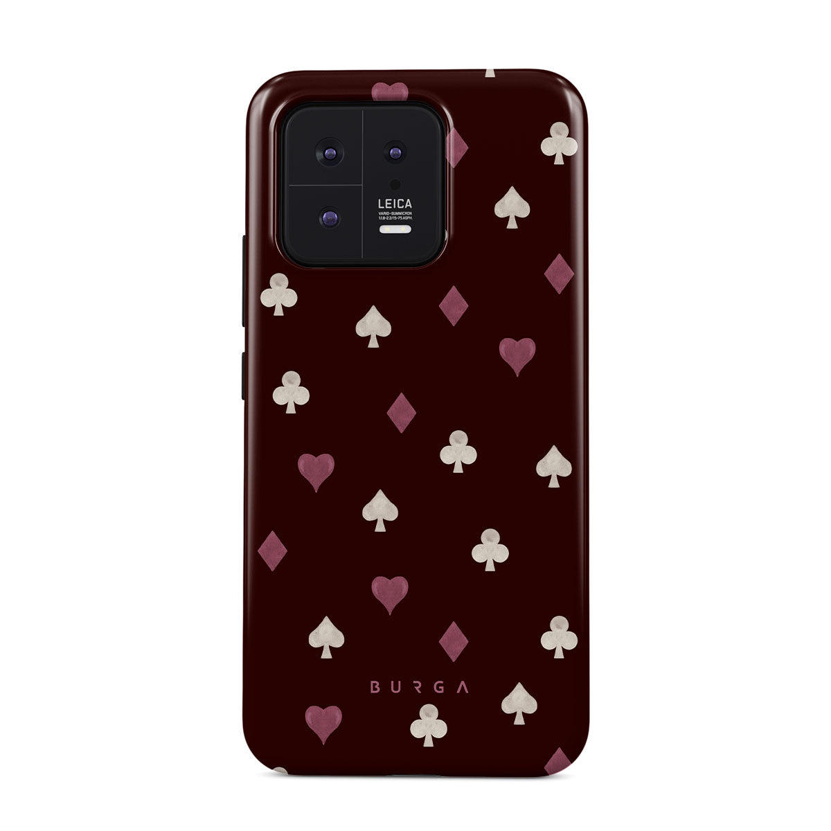 En este diseño: palos de cartas, corazones, picas, diamantes, tréboles, fondo burdeos.