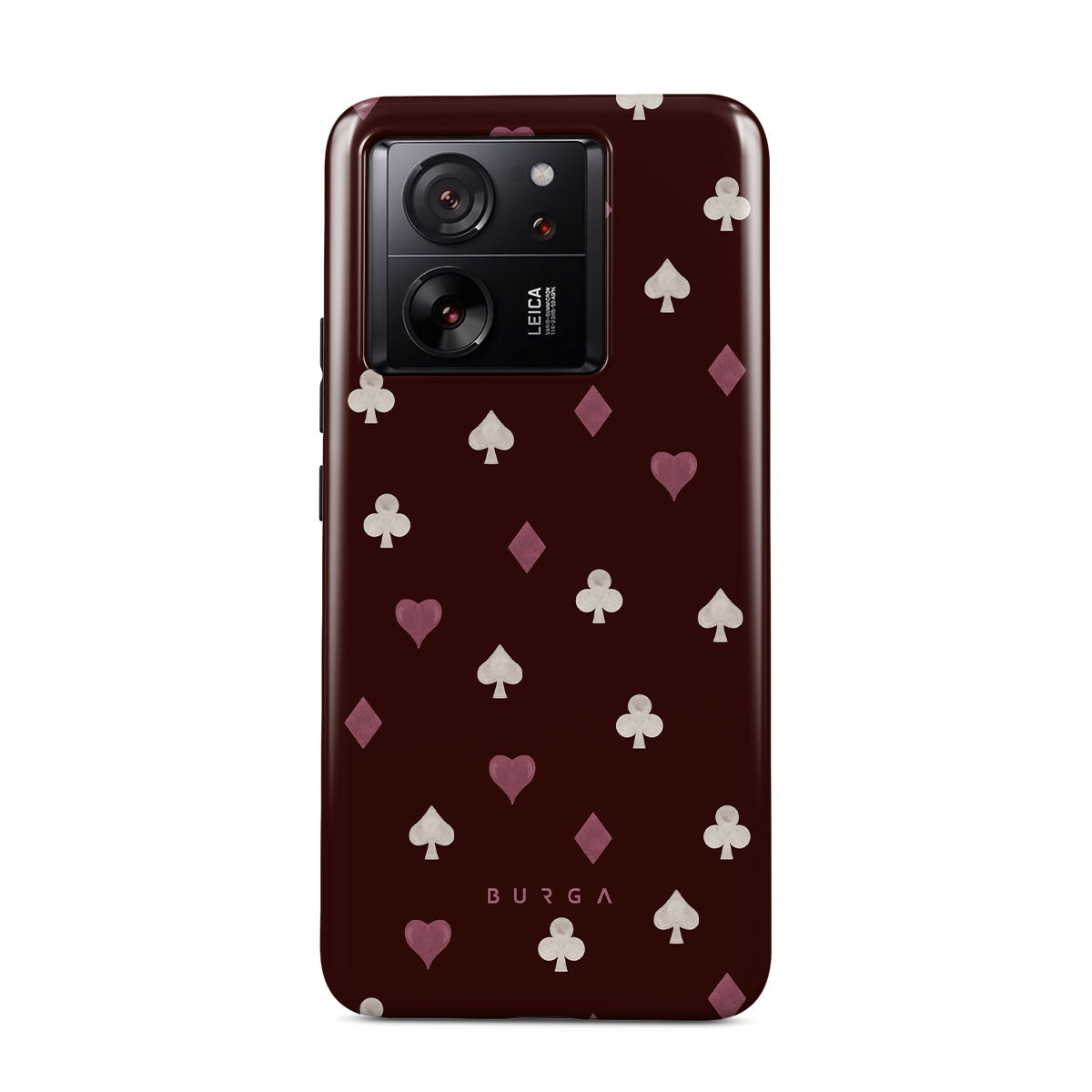 En este diseño: palos de cartas, corazones, picas, diamantes, tréboles, fondo burdeos.