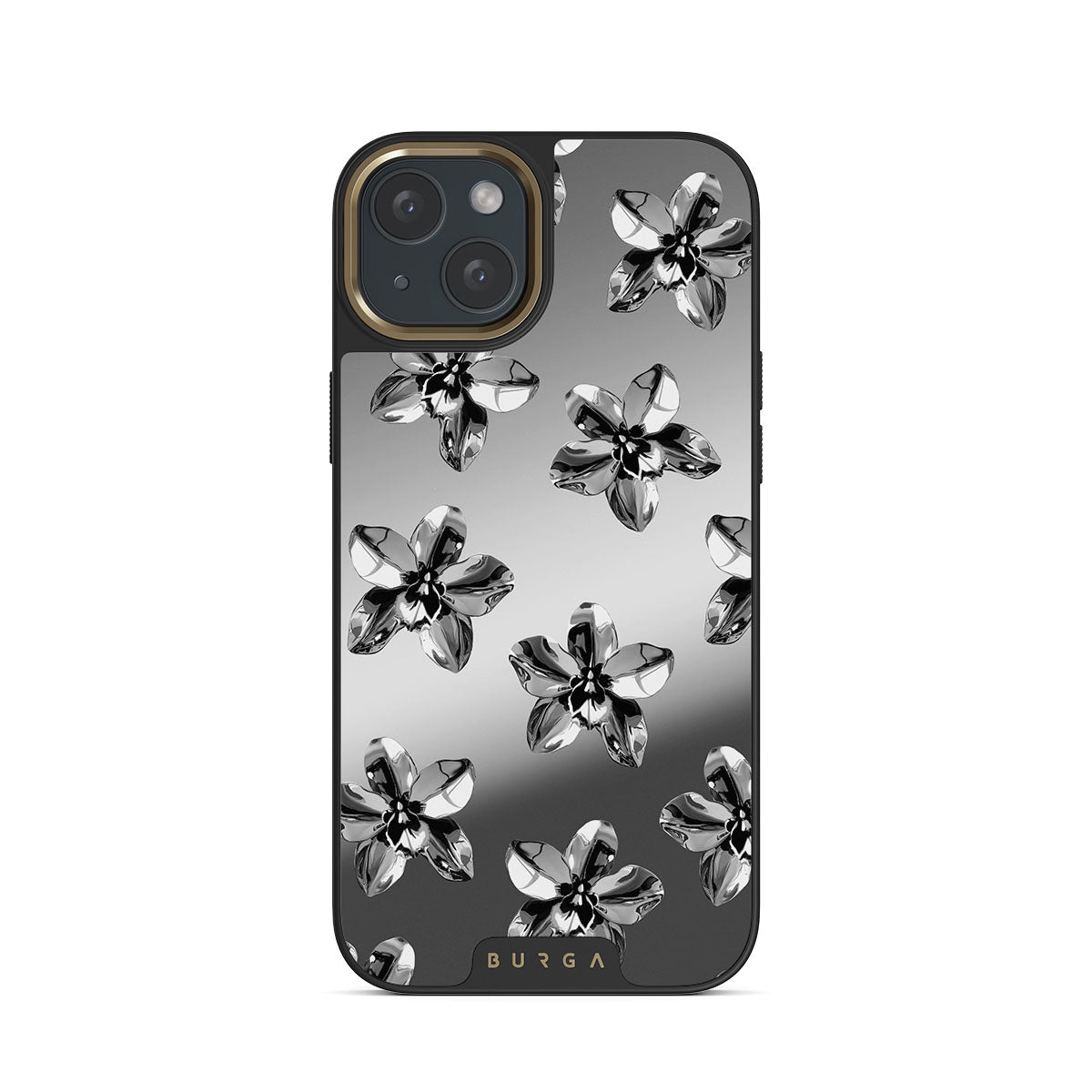 En este diseño: flores plateadas, detalles metálicos, espejo.