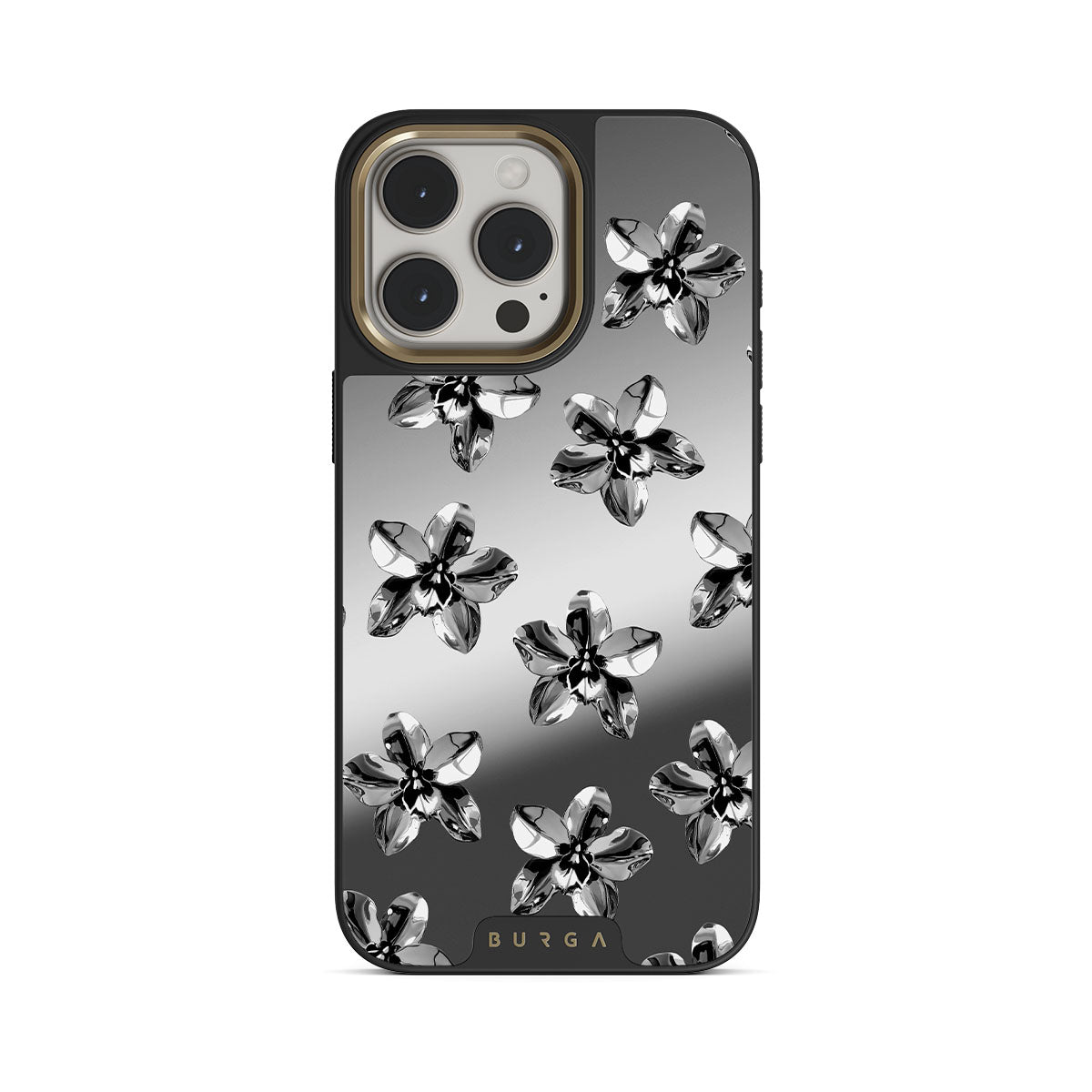 En este diseño: flores plateadas, detalles metálicos, espejo.
