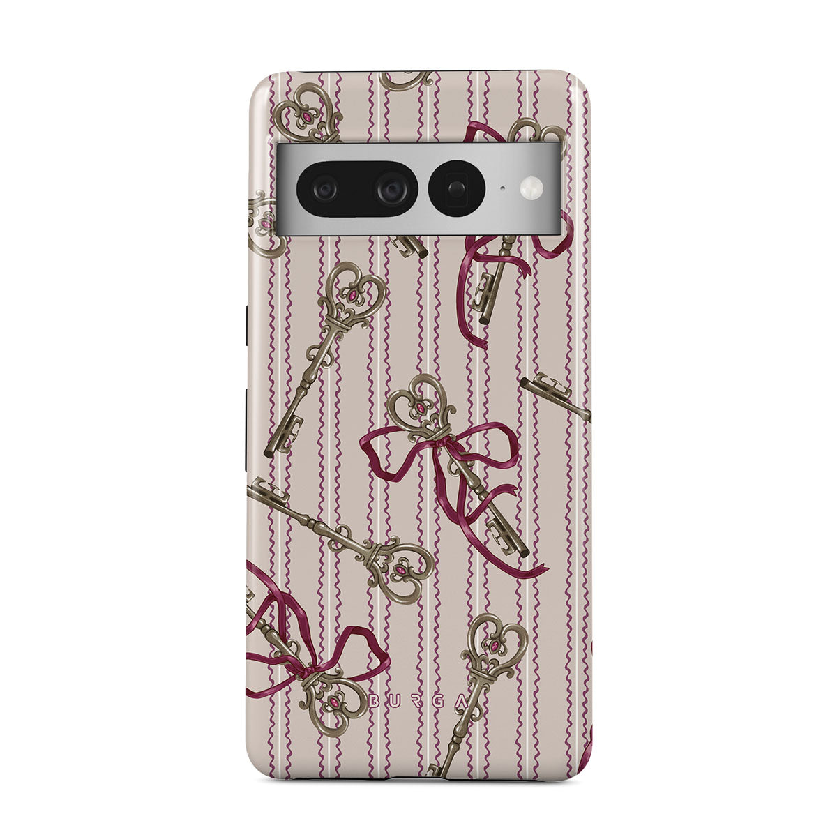 En este diseño: llaves antiguas, moños, cintas rosas, fondo a rayas.