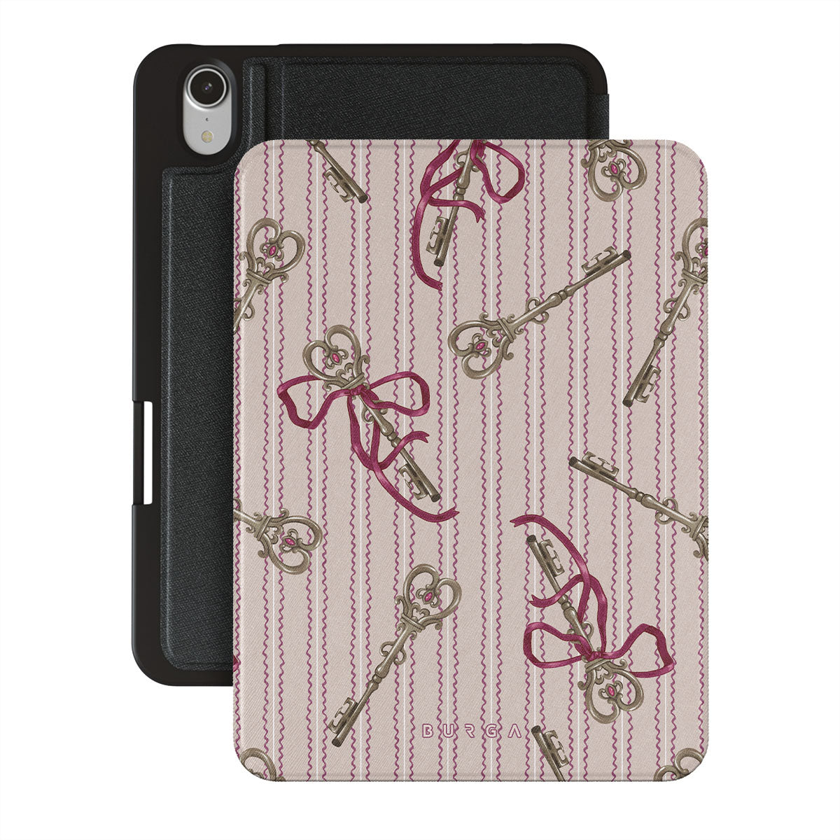 En este diseño: llaves antiguas, moños, cintas rosas, fondo a rayas.