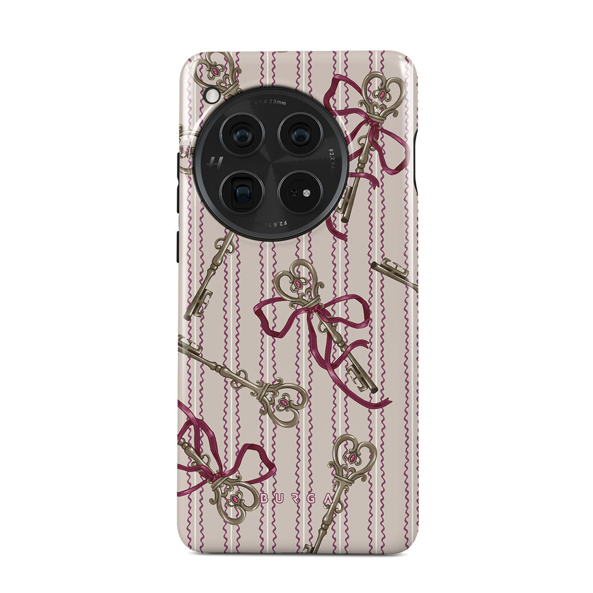 En este diseño: llaves antiguas, moños, cintas rosas, fondo a rayas.