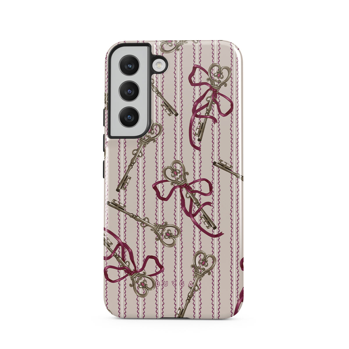 En este diseño: llaves antiguas, moños, cintas rosas, fondo a rayas.