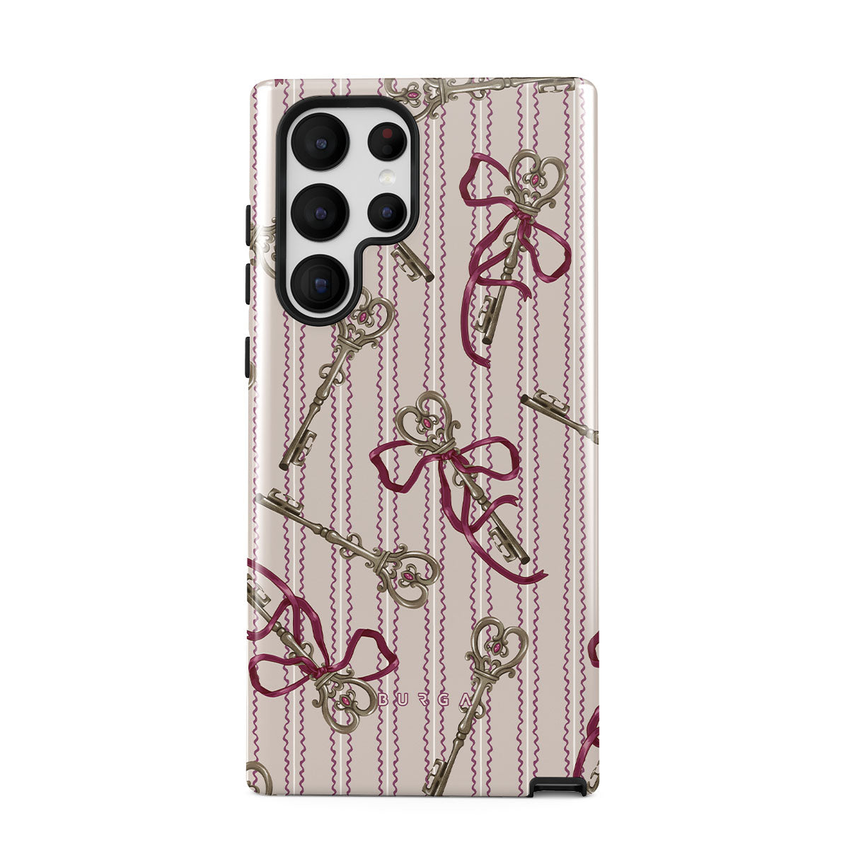 En este diseño: llaves antiguas, moños, cintas rosas, fondo a rayas.