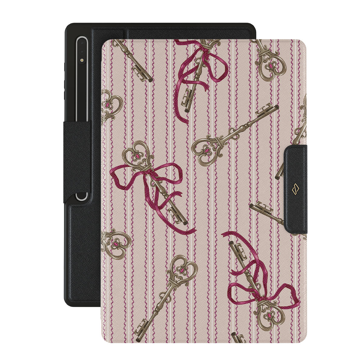 En este diseño: llaves antiguas, moños, cintas rosas, fondo a rayas.