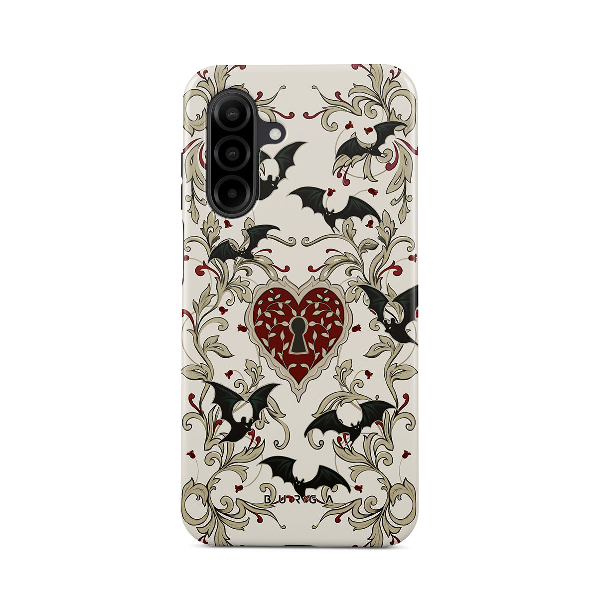 En este diseño: corazón, candado, murciélagos, motivos góticos