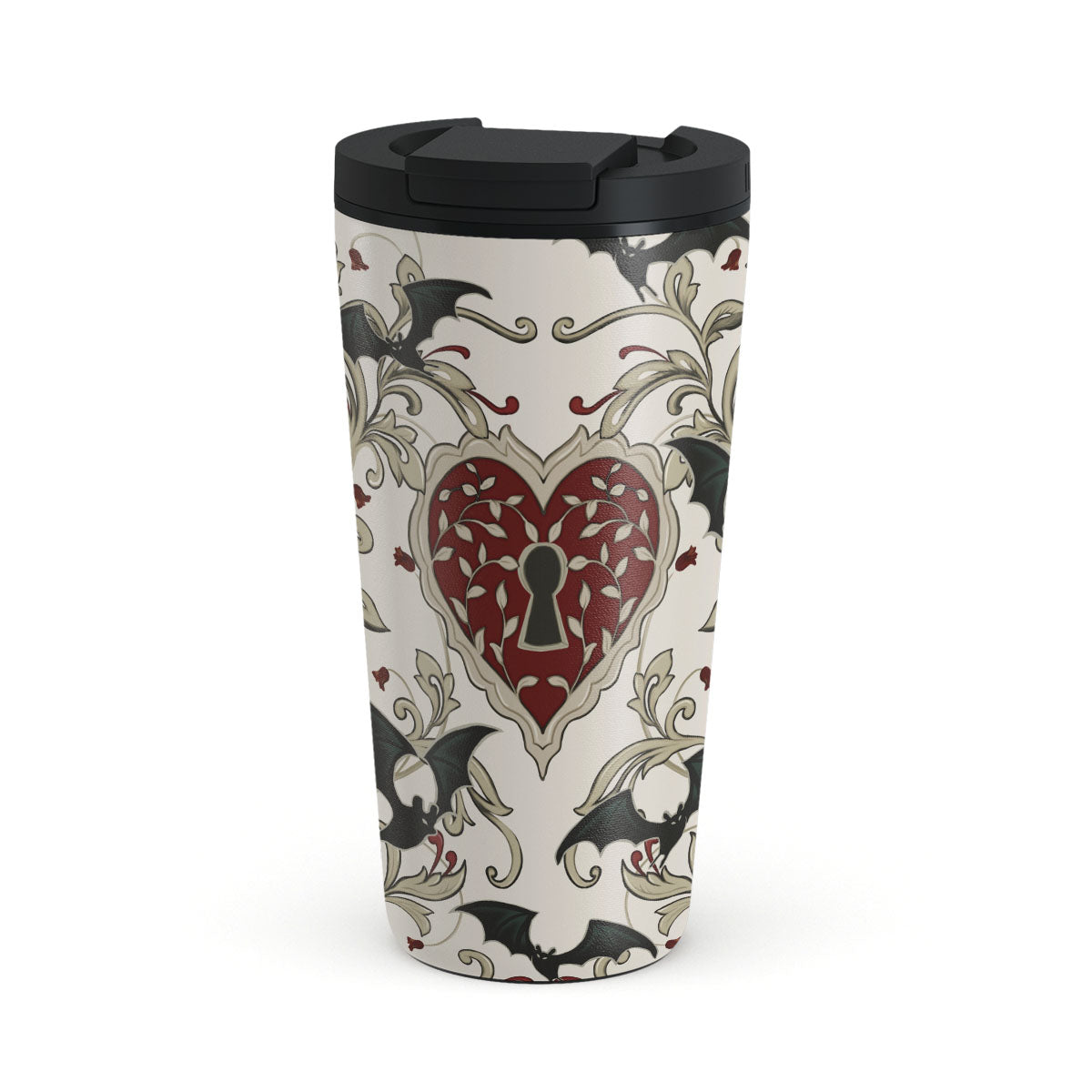 En este diseño: corazón, candado, murciélagos, motivos góticos