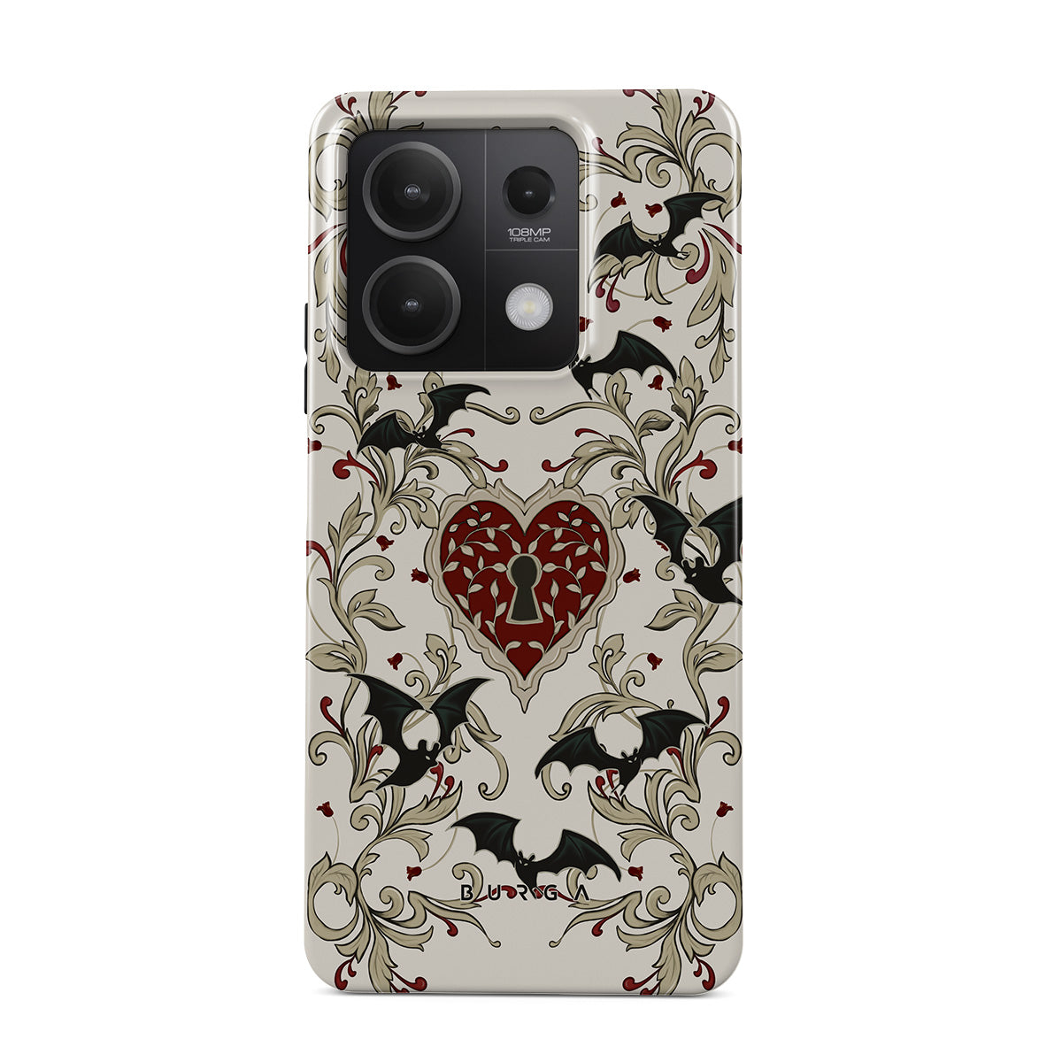 En este diseño: corazón, candado, murciélagos, motivos góticos