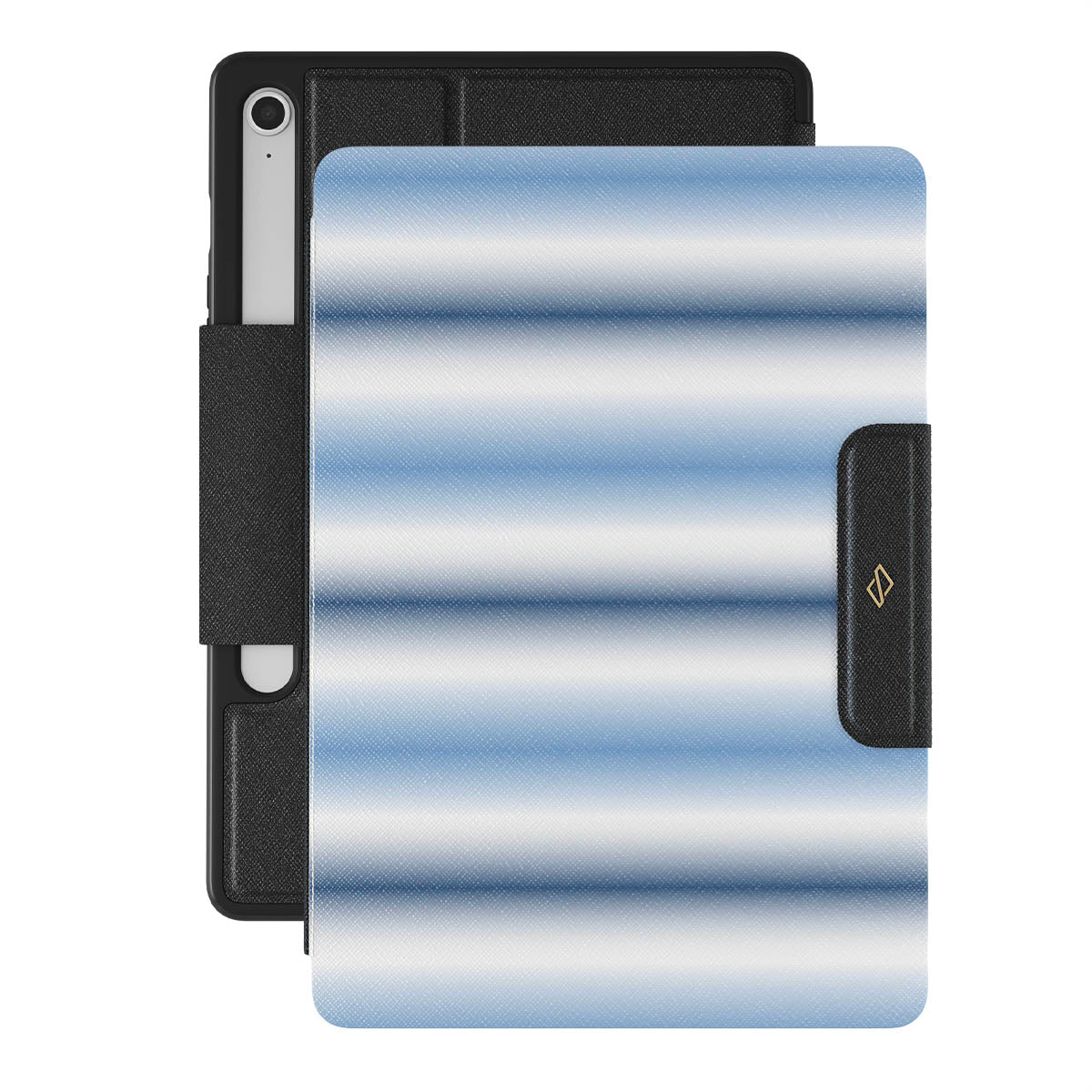 Características de este diseño: suave degradado azul, rayas horizontales blancas y azules