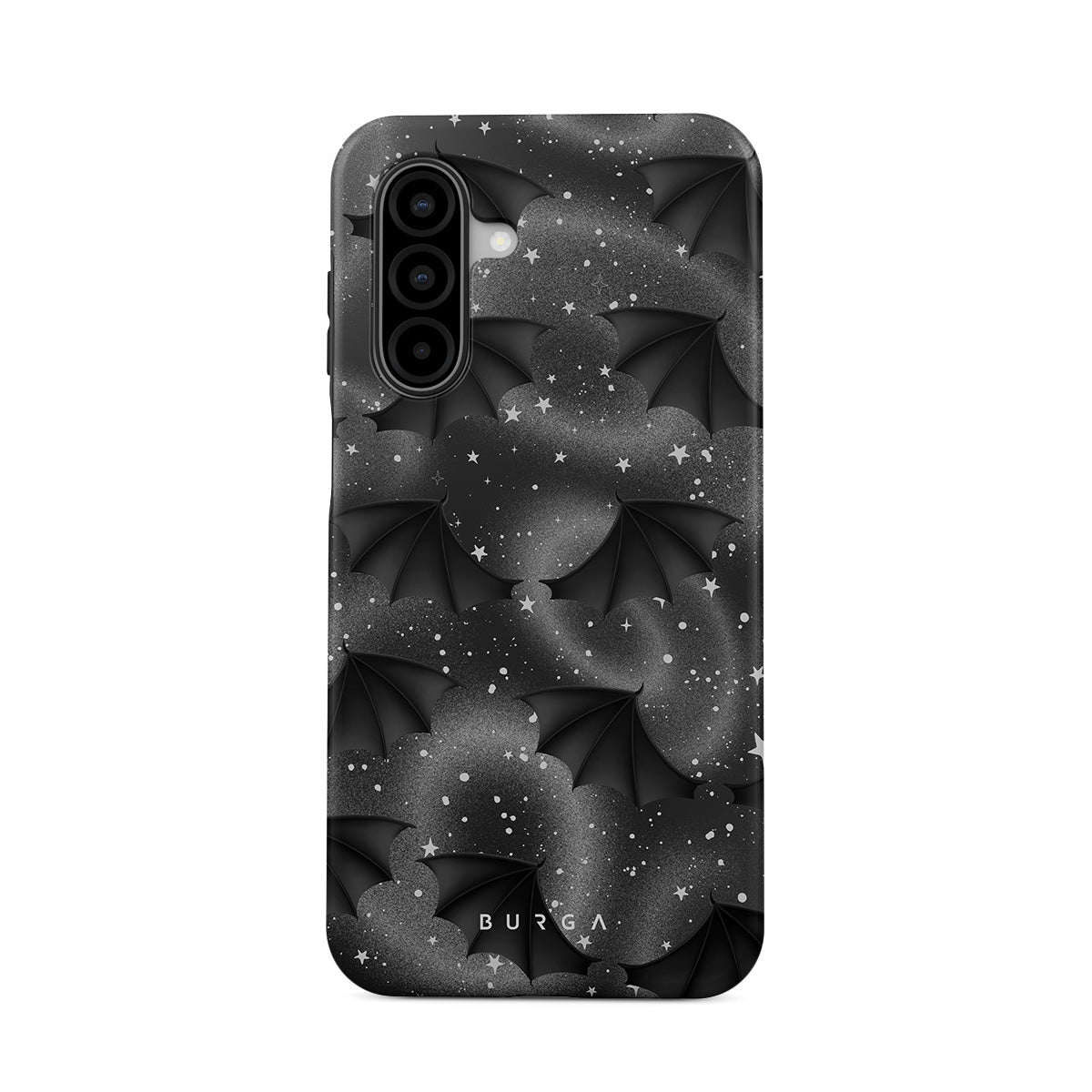 En este diseño: alas de murciélago, estrellas, remolinos místicos, cielo negro