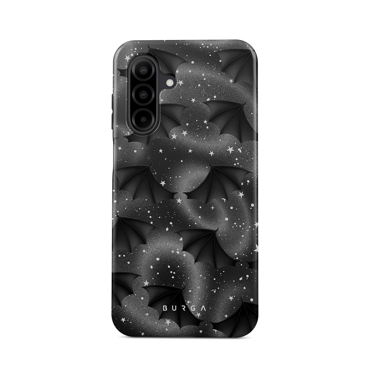 En este diseño: alas de murciélago, estrellas, remolinos místicos, cielo negro