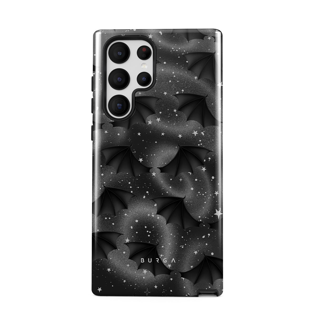 En este diseño: alas de murciélago, estrellas, remolinos místicos, cielo negro